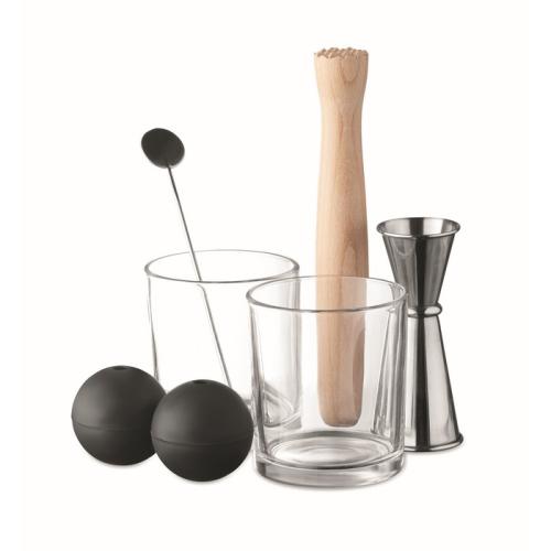 Set de verres à cocktail. Comprend 7 pièces : deux gobelets, un doseur double face en acier inoxydable (25&50 ml), un mélangeur en bois, un agitateur en acier inoxydable et deux moules à glace sphériques en silicone.
